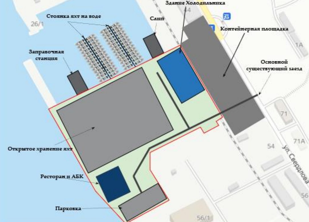 Согласно материалам закупки, комплекс предназначен для размещения и эксплуатации яхт и катеров с возможностью стоянки судов у причалов и на открытой площадке, а также обеспечения временного хранения грузов на территории контейнерного терминала.
